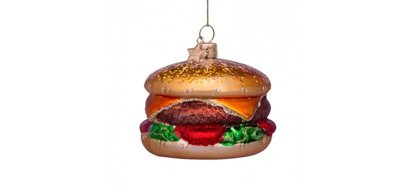 Glaskugle formet som en burger, med de fineste detaljer af hvad en god burger indeholder.